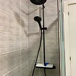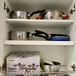 Een ingerichte kitchenette met een waterkoker, een koelkast en een oven is beschikbaar als onderdeel van de zelfvoorzienende voorzieningen van het appartement.